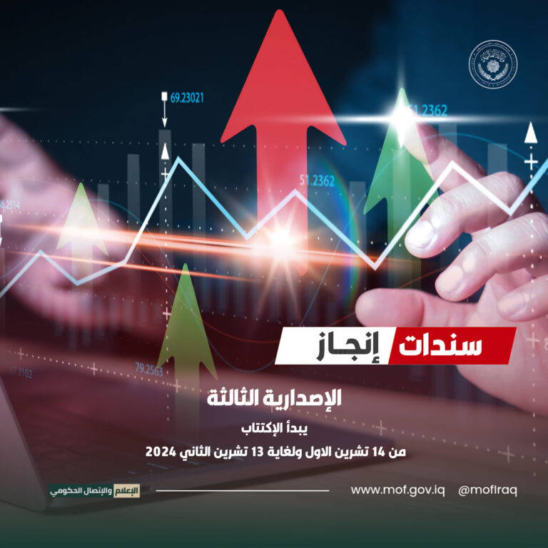 وقالت الوزارة في بيان تابعه المسرى ، “انها ، ممثلة بدائرة الدين العام وبالتعاون مع البنك المركزي العراقي، تعلن عن طرح الإصدارية الثالثة من سندات (إنجاز) الحكومية للاكتتاب العام بقيمة إجمالية تصل إلى 1.3 تريليون دينار عراقي”.