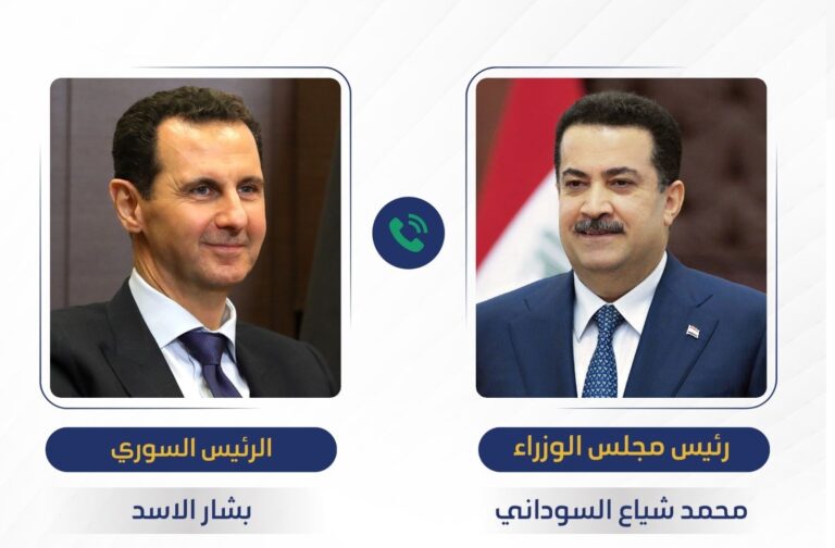 ووفقا للرئاسة السورية فإن “الرئيس بشار الأسد يبحث في اتصال هاتفي مع رئيس الوزراء العراقي محمد شياع السوداني التطورات الأخيرة والتعاون المشترك بين البلدين في مجال مكافحة الإرهاب، وعدداً من القضايا العربية والدولية”.