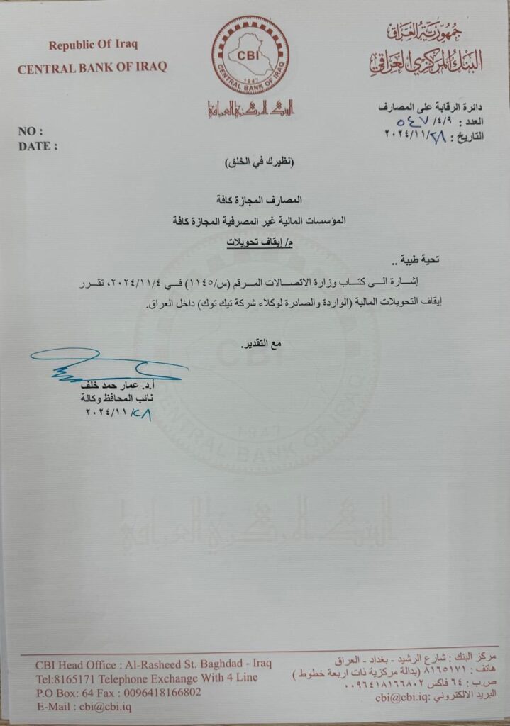 شاركها فيسبوك تويتر لينكدإن بينتيريست البريد الإلكتروني أصدر البنك المركزي العراقي، اليوم الاحد، تعميما الى المصارف المجازة والمؤسسات المالية غير المصرفية المجازة كافة بإيقاف التحويلات المالية الواردة والصادرة لوكلاء شركة تيك توك داخل العراق.