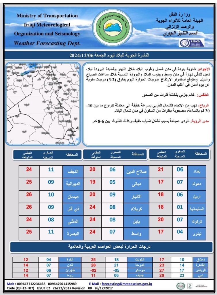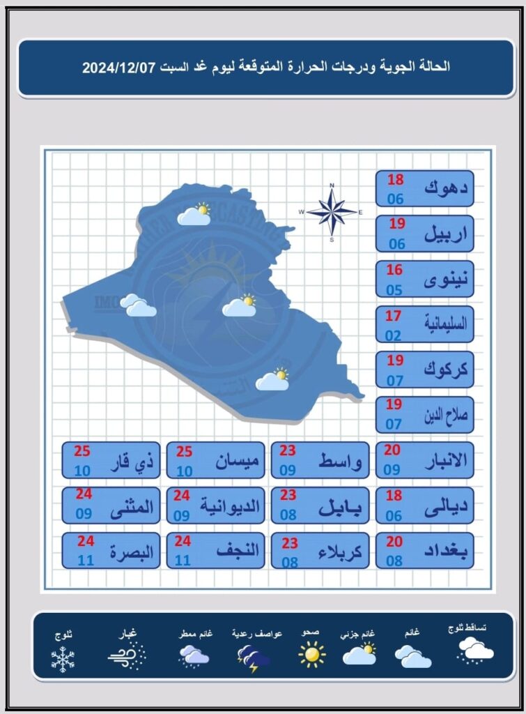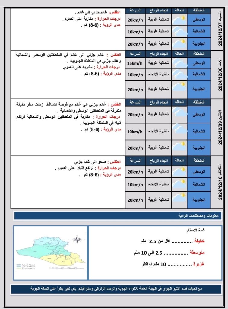 شاركها فيسبوك تويتر لينكدإن بينتيريست البريد الإلكتروني أعلنت هيئة الانواء الجوية، اليوم الجمعة، عن حالة الطقس في العراق خلال الأيام المقبلة، فيما توقعت أن تكون الأجواء شتوية باردة والطقس غائم إلى غائم جزئيا مع فترات من الصحو في الشمال, وهناك فرصة لهطول زخات مطرية في المنطقتين الوسطى والشمالية.