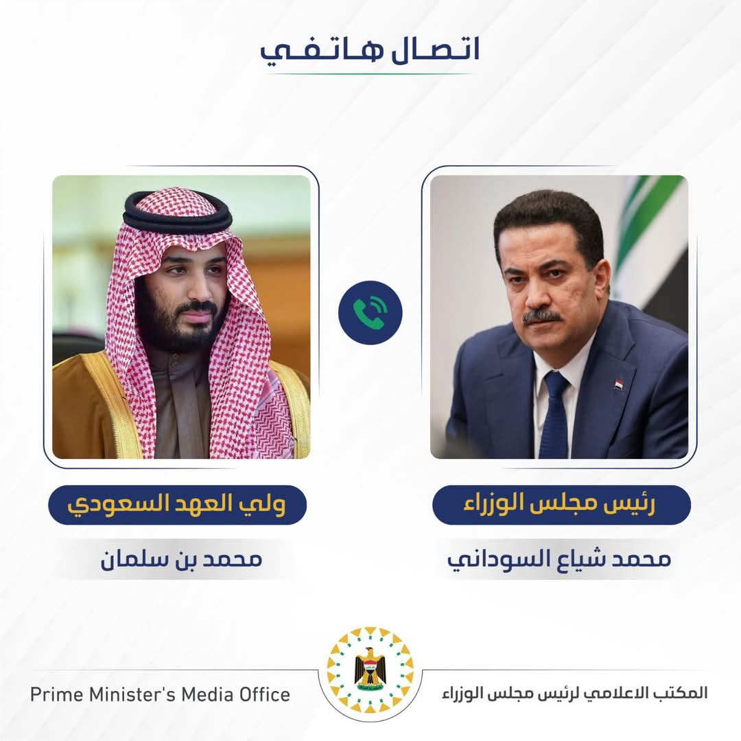 تلقى رئيس مجلس الوزراء محمد شياع السوداني، اليوم الأربعاء، اتصالاً هاتفياً من ولي عهد المملكة العربية السعودية الأمير محمد بن سلمان بن عبد العزيز آل سعود.