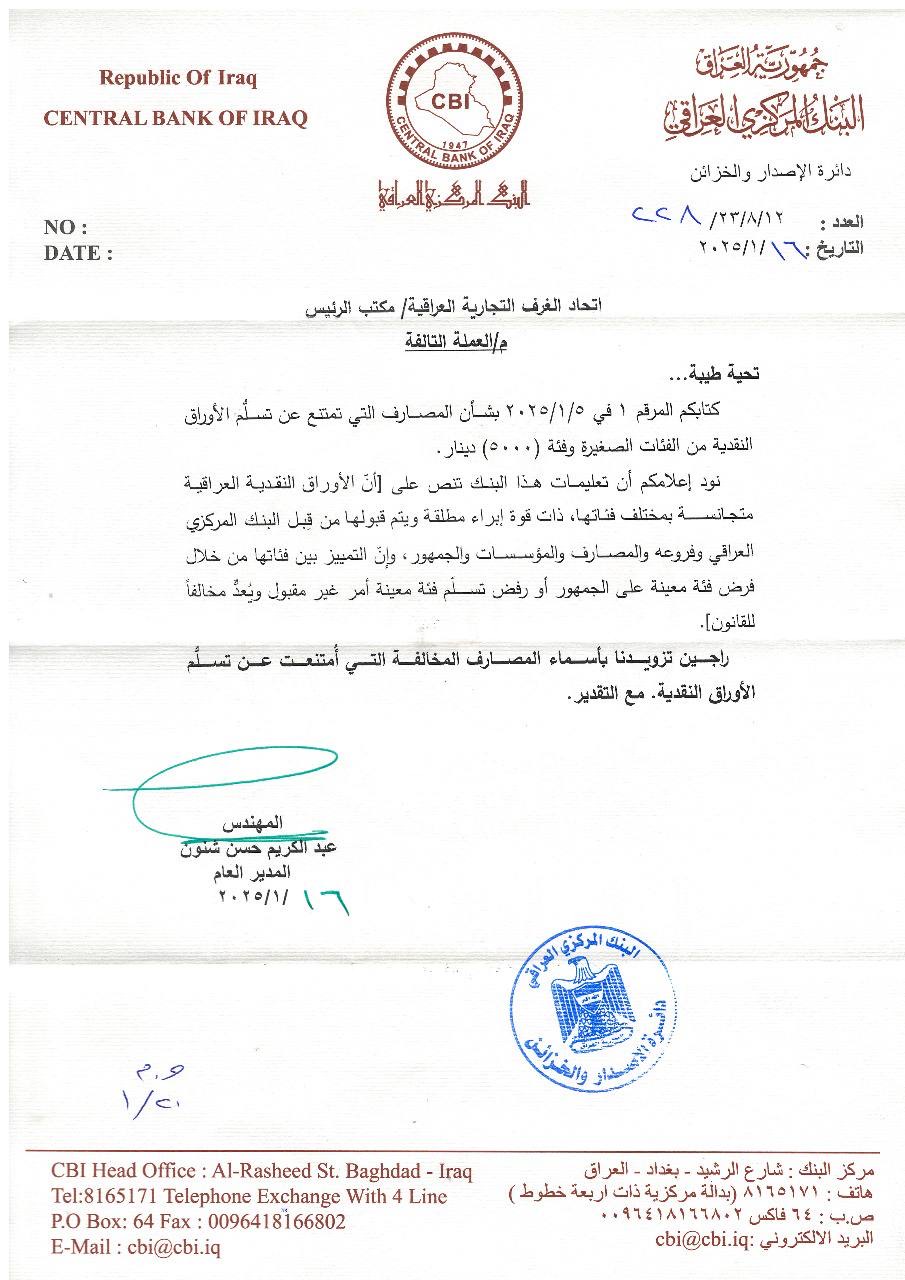 شاركها فيسبوك تويتر لينكدإن بينتيريست البريد الإلكتروني وجه البنك المركزي العراقي، عبر ( وثيقة ) حصل المسرى على نسخة منها ، اتحاد الغرف التجارية بتزويده بأسماء المصارف المخالفة للقانون في امتناعها عن استلام الأوراق النقدية الصغيرة وفئة 5000 دينار.