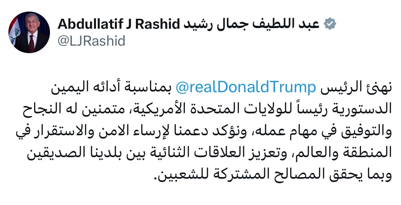 هنأ رئيس الجمهورية عبد اللطيف جمال رشيد اليوم الثلاثاء، الرئيس الأمريكي دونالد ترامب، بمناسبة أدائه اليمين الدستورية رئيساً للولايات المتحدة الأمريكية في منشور على حسابه في موقع X.