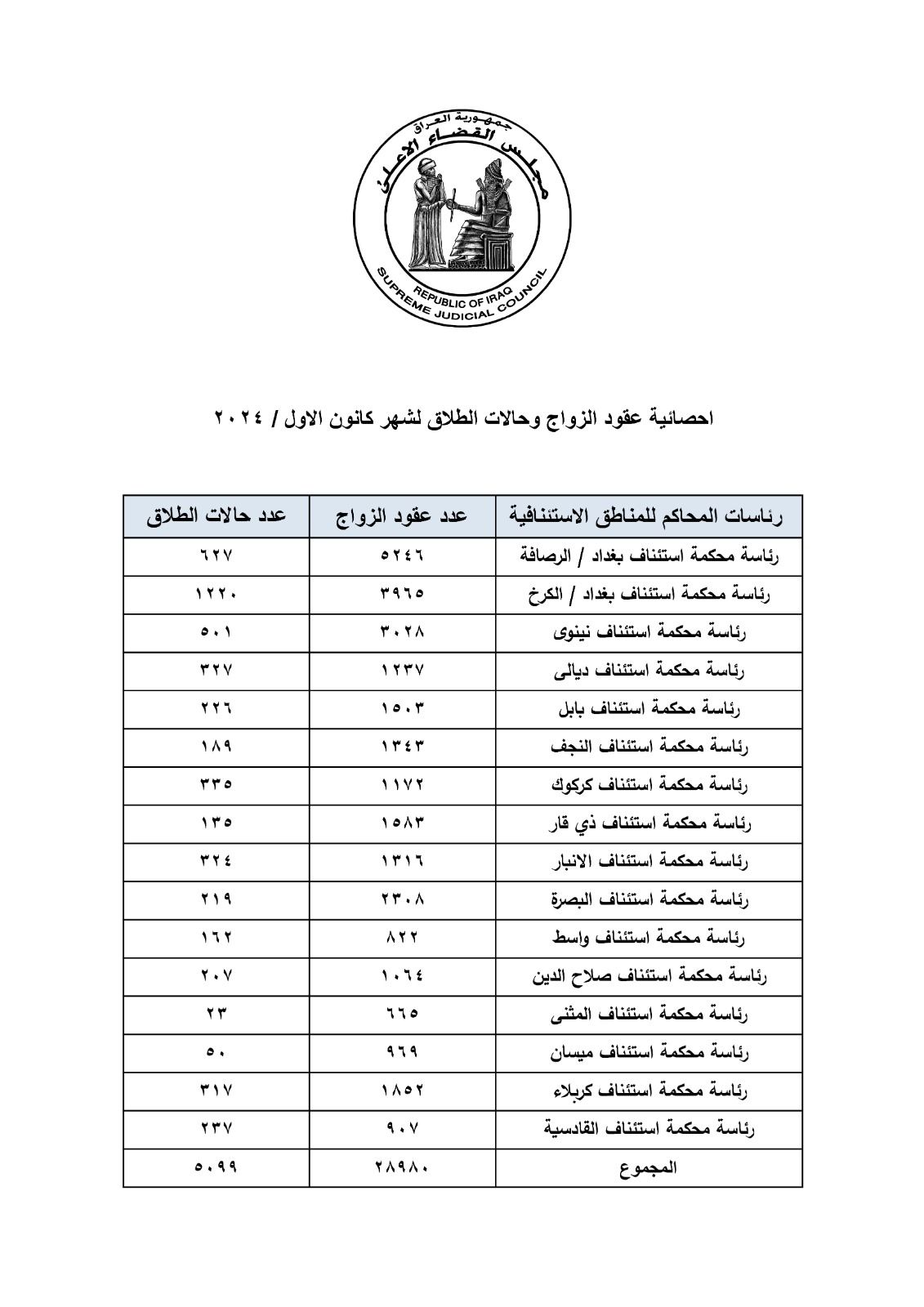 شاركها فيسبوك تويتر لينكدإن بينتيريست البريد الإلكتروني أعلن مجلس القضاء الاعلى اليوم الثلاثاء ، احصائية لحالات الزواج والطلاق لشهر كانون الاول لسنة .