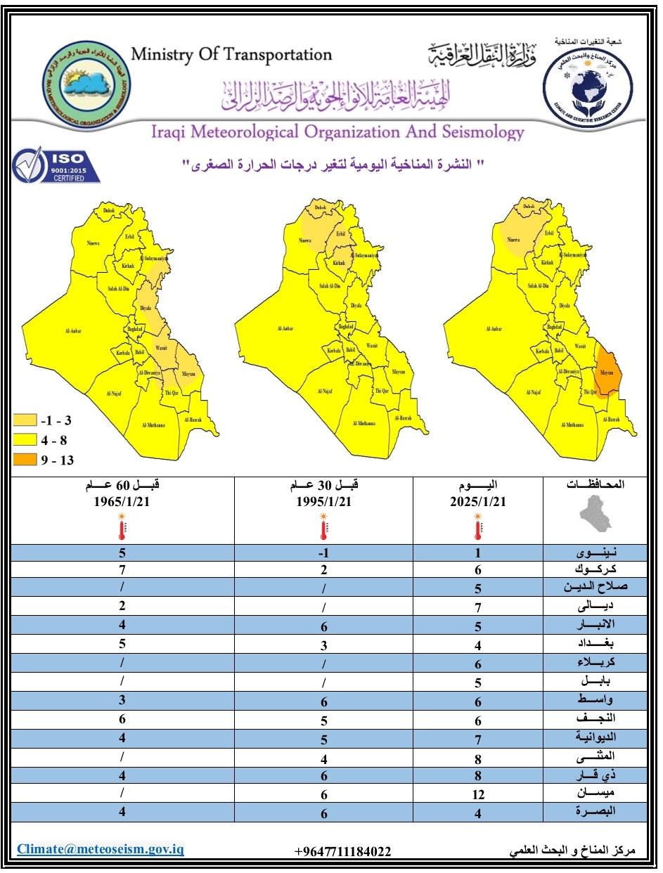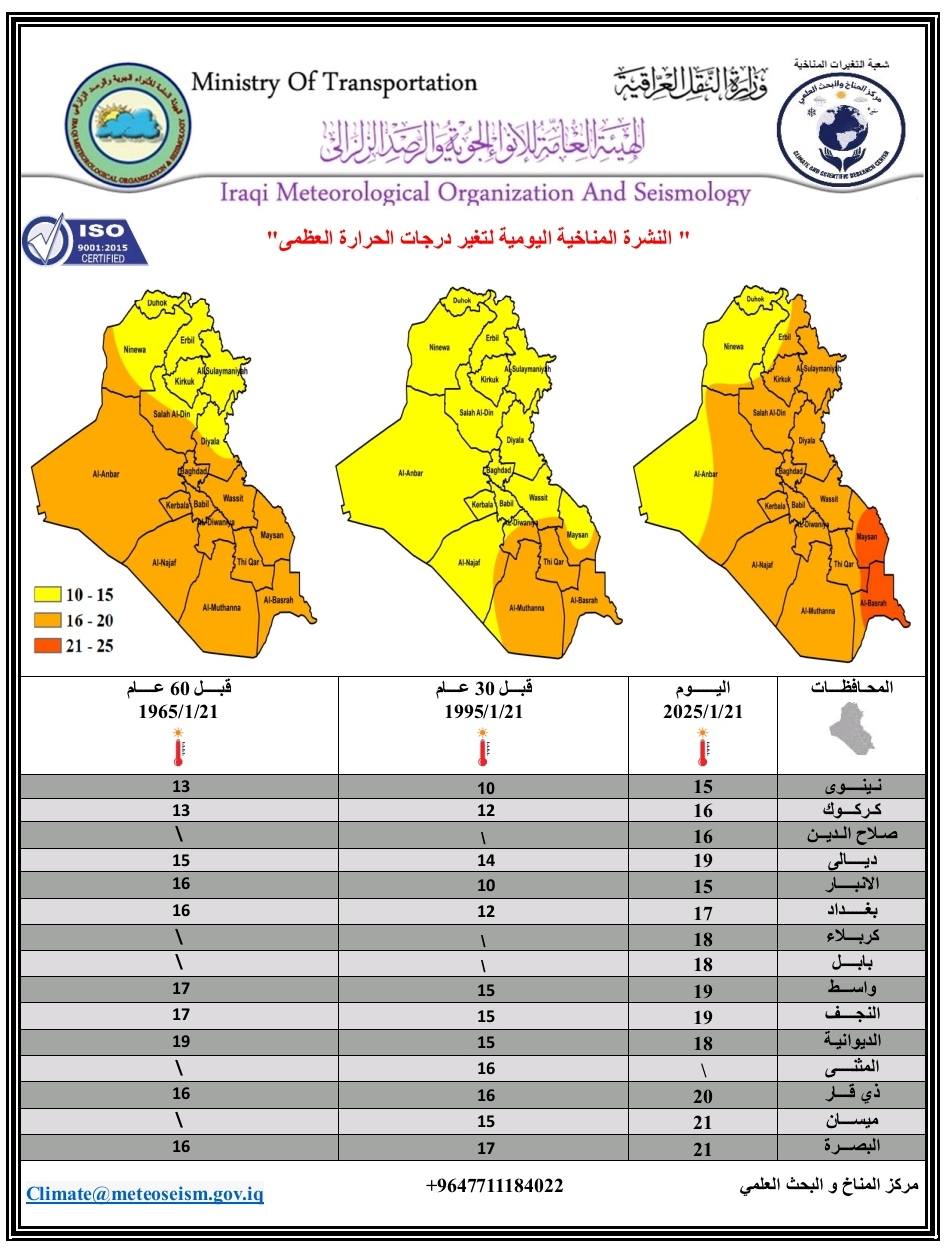 شاركها فيسبوك تويتر لينكدإن بينتيريست البريد الإلكتروني نشرت هيئة الأنواء الجوية، اليوم الثلاثاء، النشرة المناخية اليومية لتغير درجات الحرارة العظمى لأغلب محافظات البلاد، مقارنة بنفس اليوم من العامين 1995 و1965.