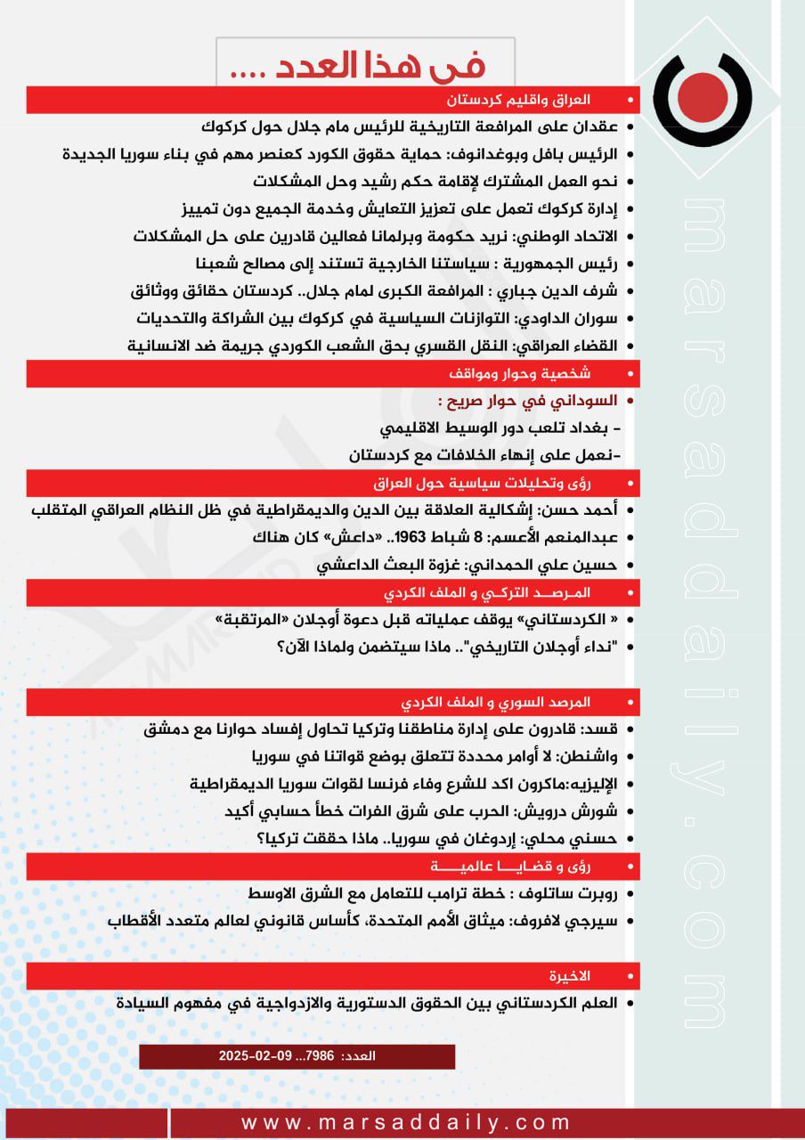 تصدرت عناوين وملفات عدد ( المرصد ) الصادر اليوم الأحد 9/2/2025 عن إعلام الاتحاد الوطني الكوردستاني ، أخبار العراق والإقليم.