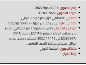 وقال مصدر قضائي في ، تصريح صحفي تابعه المسرى، إن “المحكمة الاتحادية العليا ردت الدعوى (11 اتحادية) المقامة ضد قرار رئيس الوزارء بتكليف محافظ النجف ماجد الوائلي”.