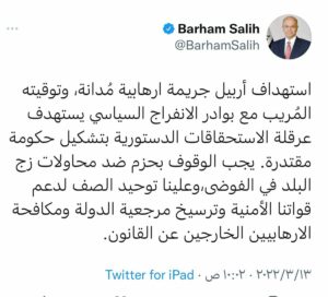 واضاف رئيس الجمهورية ، أن “استهداف أربيل جريمة ارهابية مُدانة، وتوقيته المُريب مع بوادر الانفراج السياسي يستهدف عرقلة الاستحقاقات الدستورية بتشكيل حكومة مقتدرة”.