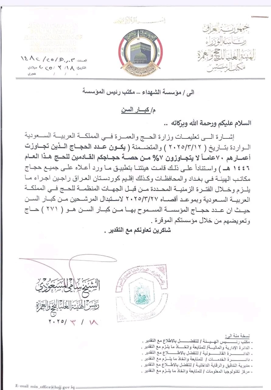 وقالت المؤسسة في وثيقة حصلت عليها المسرى ، انه “تدعو مؤسسة الشهداء الحجاج من ذوي الشهداء، ممن ظهرت أسماؤهم لموسم حج 2025 وكانوا من كبار السن (مواليد 1954 أو 1953 ونزولًا)، إلى مراجعة مديريات المؤسسة لغرض التنازل لأحد أفراد عائلة الشهيد نفسه، وفق التعليمات المعتمدة، وتقديم طلب تأجيل لموسم حج 2026”.