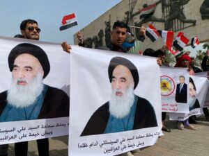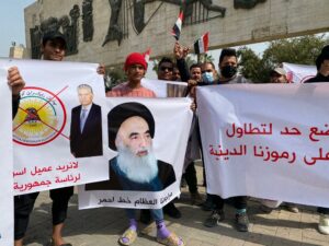 وطالب المتظاهرون بالقصاص من الكردستاني جراء تطاوله على مقام المرجعية الدينية الرشيدة ..