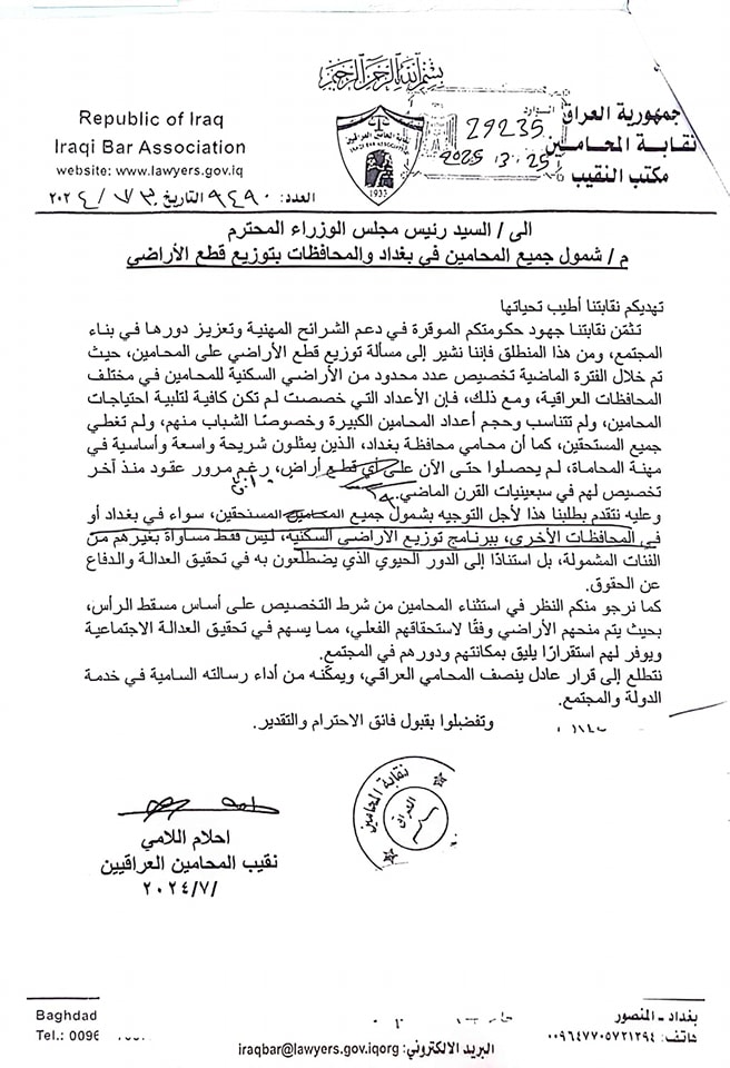 أعلنت نقابة المحامين العراقيين، اليوم الأحد، موافقة رئيس الوزراء محمد شياع السوداني على طلبها بشمول جميع المحامين في بغداد والمحافظات بتوزيع قطع الأراضي.