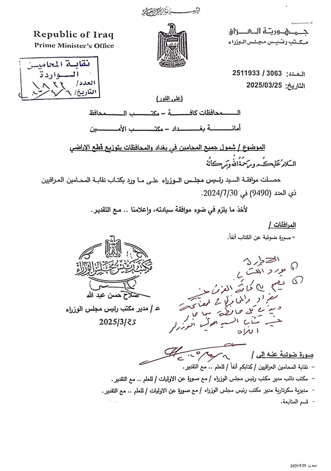وأشارت النقابة في وثائق صادرعنها تابعتها المسرى ، ان “الموافقة جاءت بناء على طلب نقابة المحامين وتعميم مباشر إلى المحافظين وأمانة بغداد”.