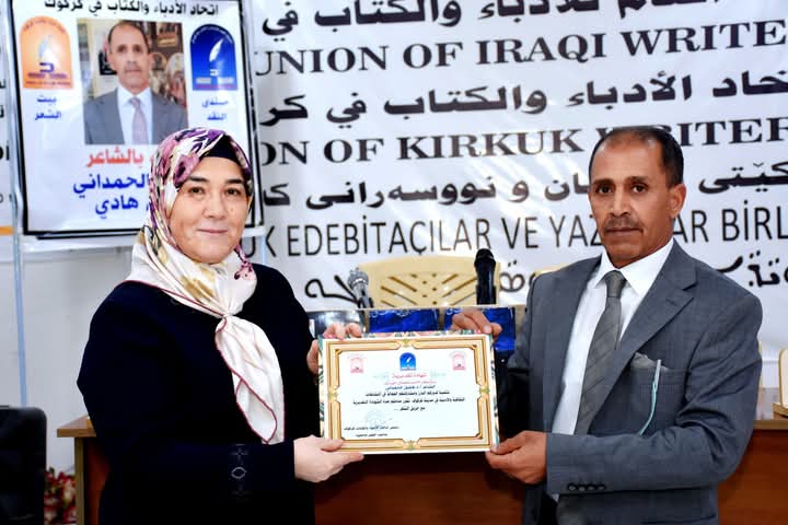 وفي الختام قدمت الدكتورة سلوى النجار الشهادات التقديرية بين د. فاضل الحمداني و د. علي هادي مقدمة من اتحاد أدباء وكتاب كركوك.