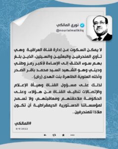شاركها فيسبوك تويتر لينكدإن بينتيريست البريد الإلكتروني هاجم رئيس ائتلاف دولة القانون نوري المالكي، ادارة قناة العراقية بسبب ” ما وصفها ” بالاساءة الى الشهيد الصدرالاول. ودعا المالكي في تغريدة له على ” تويتر ” ادارة القناة الى تنظيفها من هؤلاء وملاحقتهم ومعاقبتهم .