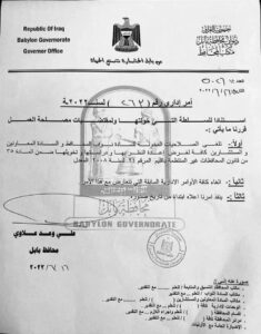 ووفق الوثيقة، فأن “محافظ بابل علي وعد علاوي اصدر امراً بالغاء كافة الصلاحيات الممنوحة لنائبيه، فضلا عن الصلاحيات الممنوحه للمستشارين”.