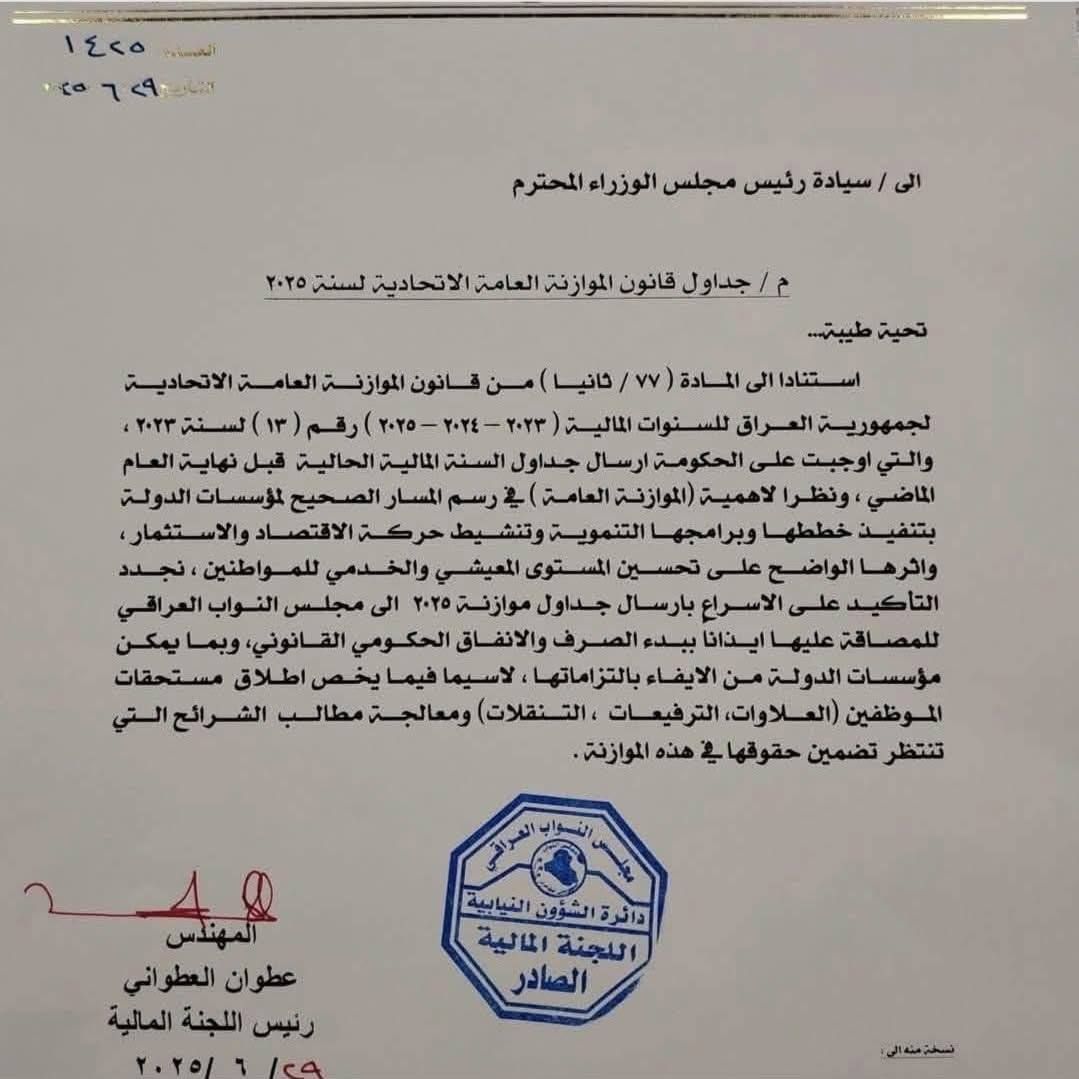 كشفت ( وثيقة ) منسوبة لرئيس اللجنة المالية البرلمانية عطوان العطواني ( حصل المسرى على نسخة منها ) ، اليوم الإثنين ، تضمنت طلبا نيابيا إلى رئيس الوزراء محمد شياع السوداني ، بإرسال جدول قانون الموازنة لعام 2025 بأسرع وقت ممكن إيذانا ببدء الصرف والإنفاق الحكومي القانوني.