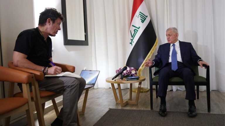 وقال رئيس الجمهورية في مقابلة مع صحيفة الموندو الاسبانية: موقفنا في العراق واضح تماما بالوقوف مع القضية الفلسطينية، وما تعرضوا له في الحرب اعمال إجرامية ضد المدنيين خصوصا الأطفال والنساء، ولن تحل الازمة الا بنيل الفلسطينيين حقوقهم المشروعة.