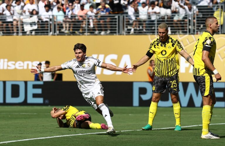 شاركها فيسبوك تويتر لينكدإن بينتيريست البريد الإلكتروني حسم ريال مدريد التأهل للدور نصف النهائي لكأس العالم للأندية، بالفوز بنتيجة (3-2) على بوروسيا دورتموند الألماني. وبهذا الانتصار يضرب الميرنجي موعدًا مع باريس سان جيرمان الفرنسي في الدور نصف النهائي.