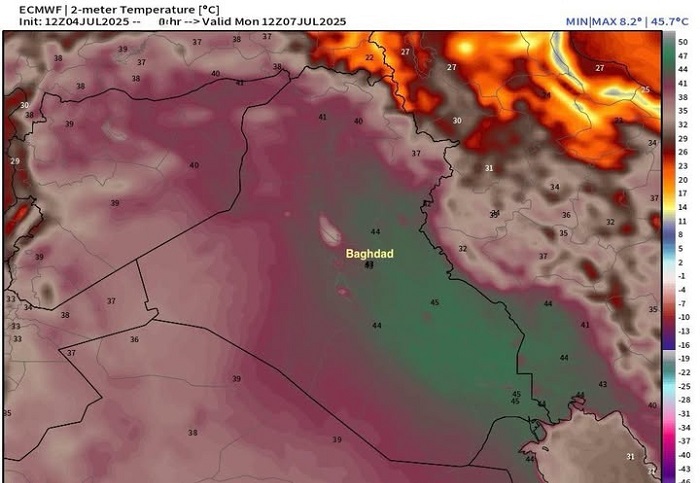 واضاف ،”من المتوقع أن تسجّل درجات الحرارة العظمى خلال أيام الاثنين والثلاثاء والأربعاء المقبل في العاصمة بغداد ومدن الوسط ما بين 44 إلى 46 درجة مئوية، في حين تكون في مدن الجنوب ما بين 45 إلى 48 درجة مئوية، بينما تتراوح في مدن الشمال والأنبار ما بين 41 إلى 44 درجة مئوية، لتكون الأجواء صيفية وحارة بامتياز في كافة المدن”.