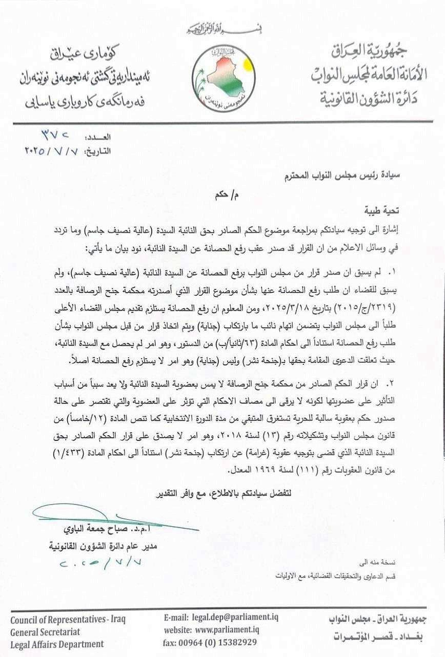 أوضح مجلس النواب اليوم الإثنين ، أن”محكمة جنح الرصافة أصدرت حكماً يقضي بفرض غرامة على النائب عالية نصيف جاسم في قضية تتعلق بجنحة نشر”.