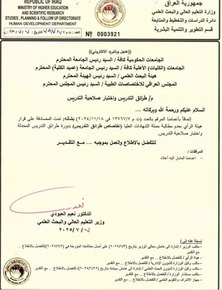 صادق وزير التعليم العالي والبحث العلمي نعيم العبودي، على قرار يخص حملة الشهادات العليا.