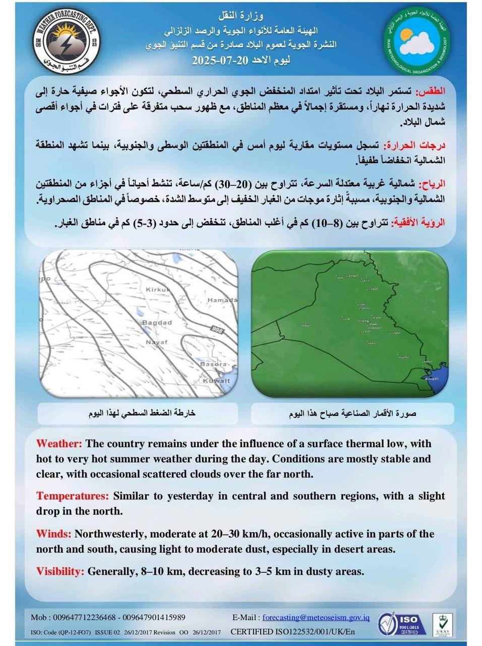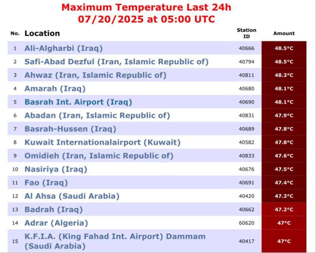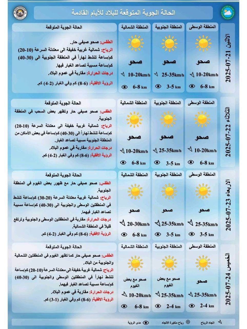 شاركها فيسبوك تويتر لينكدإن بينتيريست البريد الإلكتروني كشفت هيئة الأنواء الجوية، اليوم الأحد، عن حالة الطقس في البلاد خلال الأيام الأربعة القادمة، فيما توقعت استمرار ارتفاع درجات الحرارة وتصاعداً للغبار وغيوماً متفرقة.