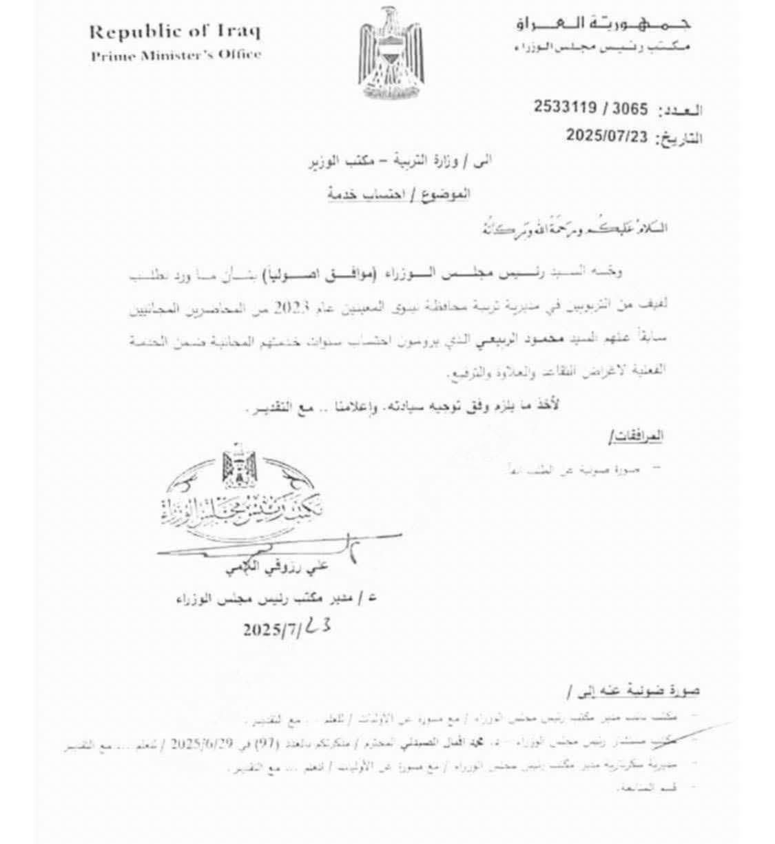 شاركها فيسبوك تويتر لينكدإن بينتيريست البريد الإلكتروني وافق رئيس مجلس الوزراء محمد شياع السوداني ( بحسب وثيقة منسوبة اليه )، على طلب تقدمت به مجموعة من التربويين ، لاحتساب سنوات الخدمة المجانية للمحاضرين والإداريين المعينين عام 2023 لاغراض التقاعد والعلاوة والترفيع . almasra