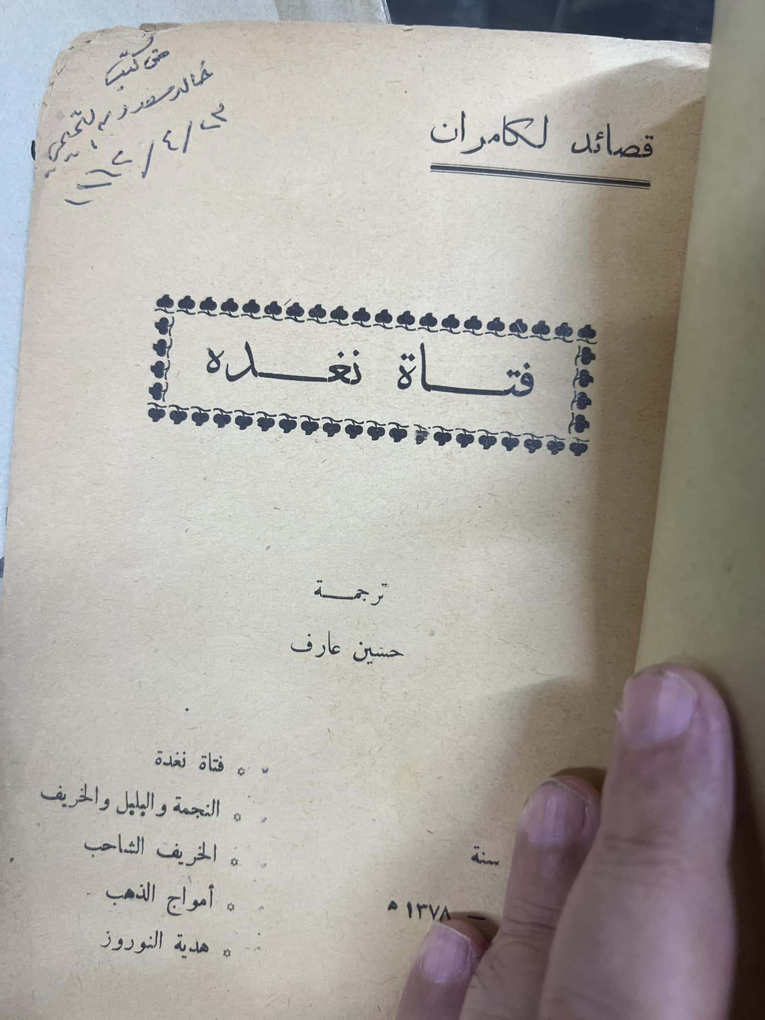 و دققت في الاسم والتاريخ بتمعن :،من هو صاحب هذا التوقيع العربي الأصيل (خالد) و (سعدون )و(التميمي) الذي يوحي بأنتماء خليجي ..هذا التميمي المعتز بلقبه العزيز الذي يتابع من ضمن مايتابع نصوص من الأدب الكردي المترجم في بدايات التعريف المهني و الحرفي حيث تخصيص مجموعة شعرية كاملة لشاعر واحد؟ ثم إذا كان الكتاب قد صدر في بداية ازدهار العلاقة بين الكرد و جمهورية قاسم حيث شهر عسل متذبذب لم يستمر سوى ثلاث سنوات فأن تاريخ التوقيع يستحق التوقير اكثر. يوم الثالث والعشرين من عام ١٩٦٢ اي في خضم ثورة أيلول حيث النفير القاسمي ضد الكرد ببيشمركتهم و ناسهم و أدبهم الرومانسي المتفتح وقتها على الشريك العربي في الوطن.