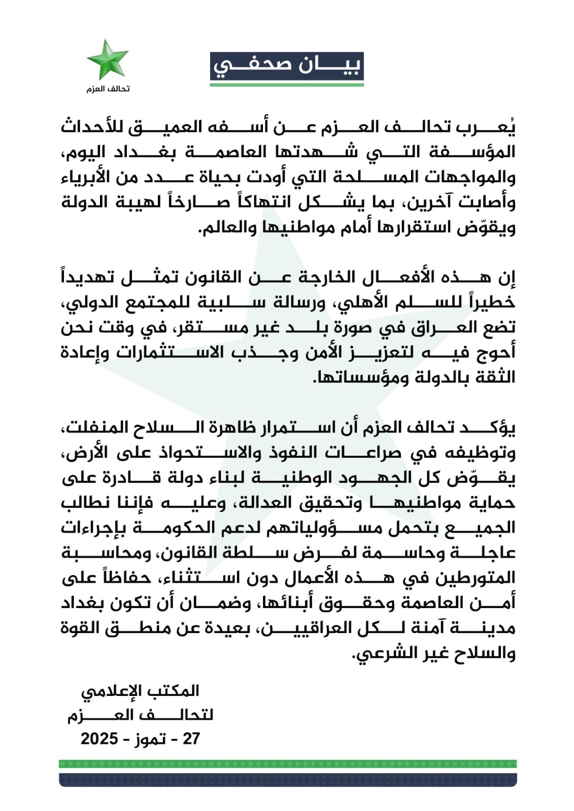 تحالف العزم أعرب عن أسفه العميق للأحداث المؤسفة التي شهدتها العاصمة بغداد ، والمواجهات المسلحة التي أودت بحياة عدد من الأبرياء وأصابت آخرين، بما يشكل انتهاكاً صارخاً لهيبة الدولة ويقوّض استقرارها أمام مواطنيها والعالم.