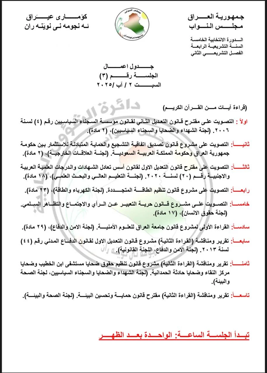 وبحسب جدول أعمال الجلسة رقم (٣) للفصل التشريعي الثاني، للدورة الانتخابية الخامسة، لسنة التشريعية الرابعة، الذي نشرته الدائرة الإعلامية بمجلس النواب، فإن الجلسة تبدأ الساعة الواحدة بعد ظهر اليوم السبت، وتتضمن عدد من الفقرات، الأولى منها ” التصويت على مقترح قانون التعديل الثاني لقانون مؤسسة السجناء السياسيين رقم (٤) لسنة ٢٠٠٦”.