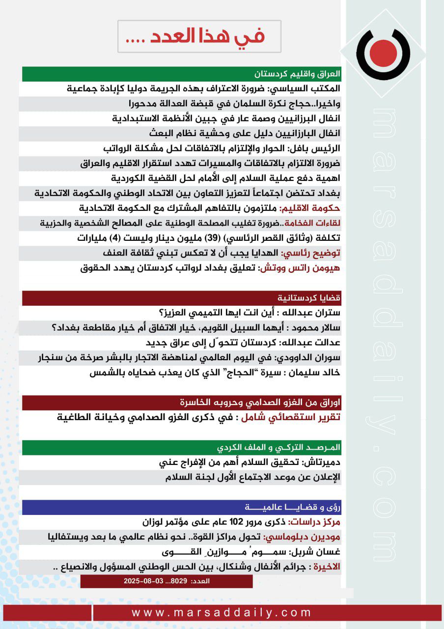 شاركها فيسبوك تويتر لينكدإن بينتيريست البريد الإلكتروني صدر اليوم الأحد 3 آب 2025 العدد 8029 من مجلة ( المرصد ) عن إعلام الاتحاد الوطني الكوردستاني، ترويسته تضمنت “ضرورة الإعتراف الدولي بما تعرض له المكون الأيزيدي من إبادة جماعية على يد عصابات داعش الإرهابية وحجاج نقرة السلمان في قبضة العدالة مدحورا “. إنقر هنا لمطالعة العدد almasra