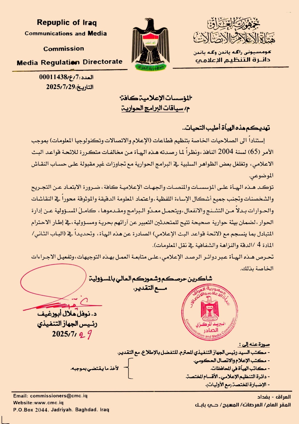 شاركها فيسبوك تويتر لينكدإن بينتيريست البريد الإلكتروني أعلنت هيئة الإعلام والاتصالات،اليوم الأحد 3 آب 2025 عن إعداد توجيهات جديدة تتعلق بضوابط الحوار وسياقات النقاش في المنابر والمنصات والشاشات. وقالت “بالتزامن مع موسم زيارة الأربعين للامام الحسين” عليه السلام، أكدت الهيئة أهمية تجنّب خطاب الكراهية وتعزيز القيم الإنسانية”. طالع من هنا الفيديو بالتفاصيل almasra