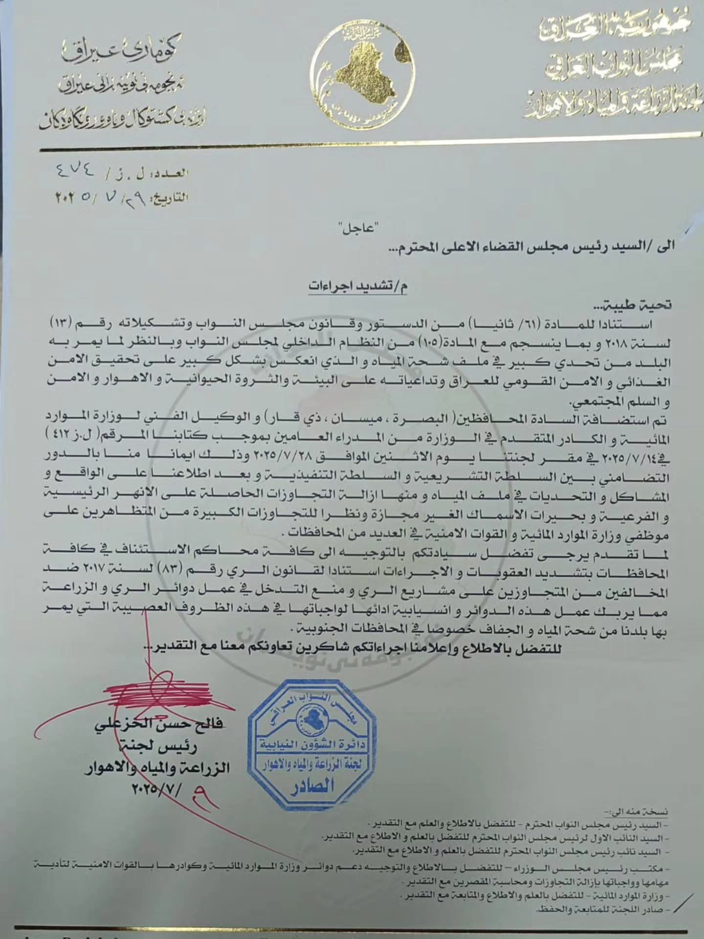 أعلنت لجنة الزراعة والمياه والأهوار النيابية، اليوم الثلاثاء، أن رئيس مجلس القضاء الأعلى وجّه رؤساء محاكم الاستئناف بتطبيق أحكام قانون الري رقم (83) لسنة 2017، بهدف مواجهة الشح المائي وضمان وصول المياه للمناطق المحتاجة، خاصة في المحافظات الجنوبية.