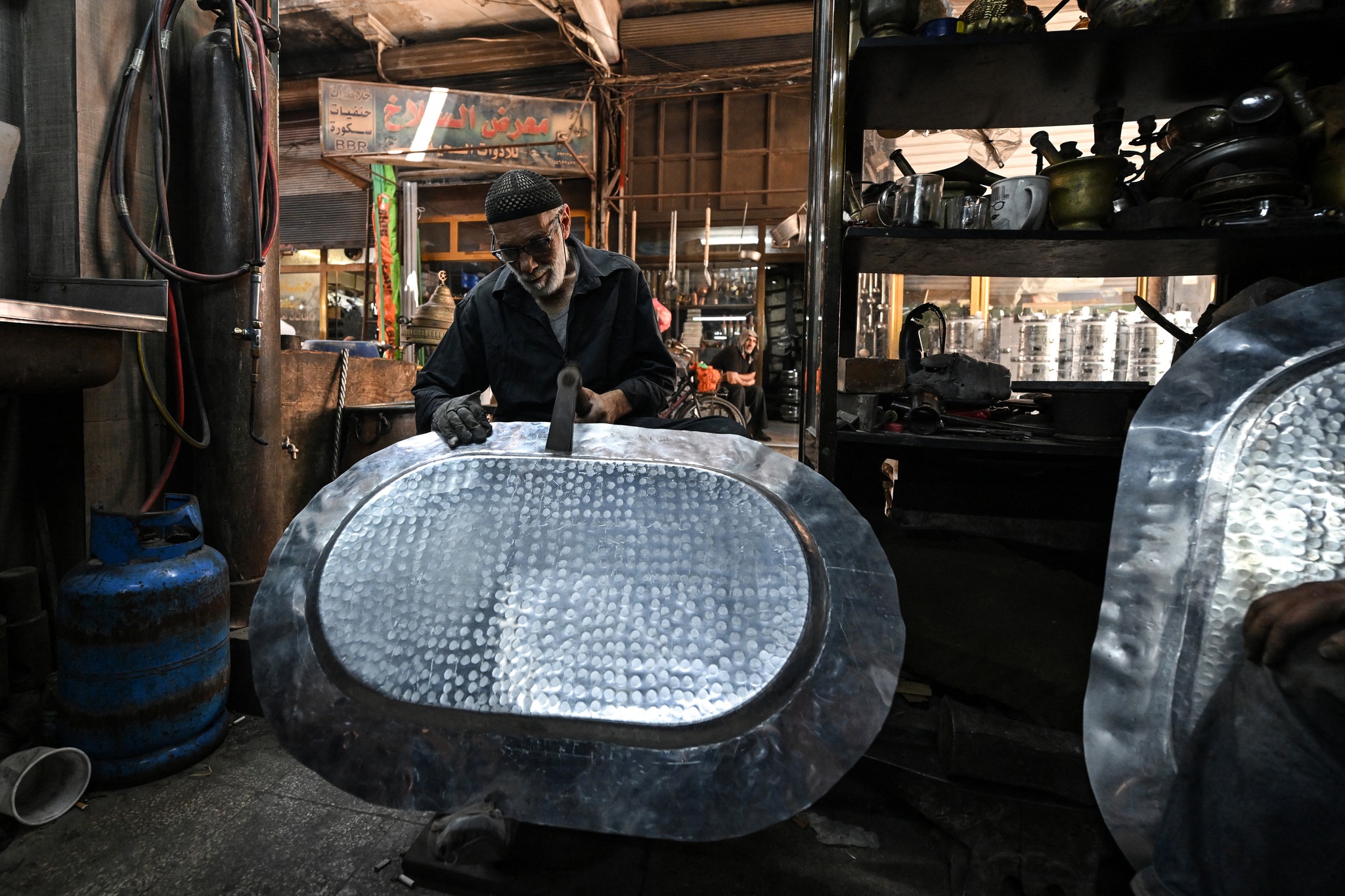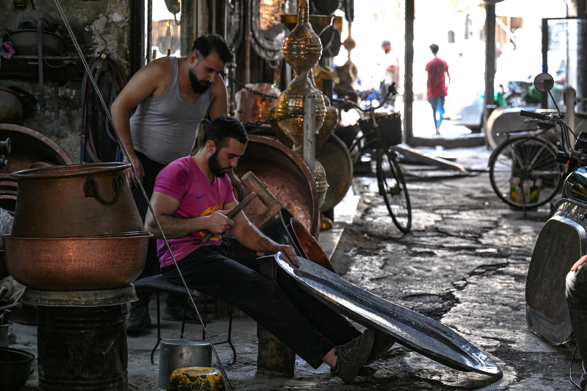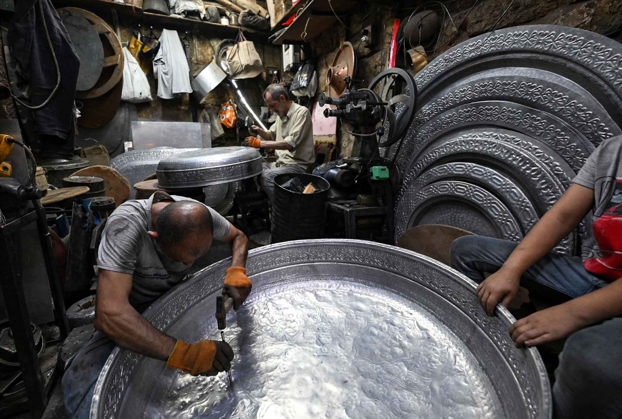 شاركها فيسبوك تويتر لينكدإن بينتيريست البريد الإلكتروني يقوم حرفيون سوريون بنحت نقوش على وعاء نحاسي كبير باستخدام المطارق.