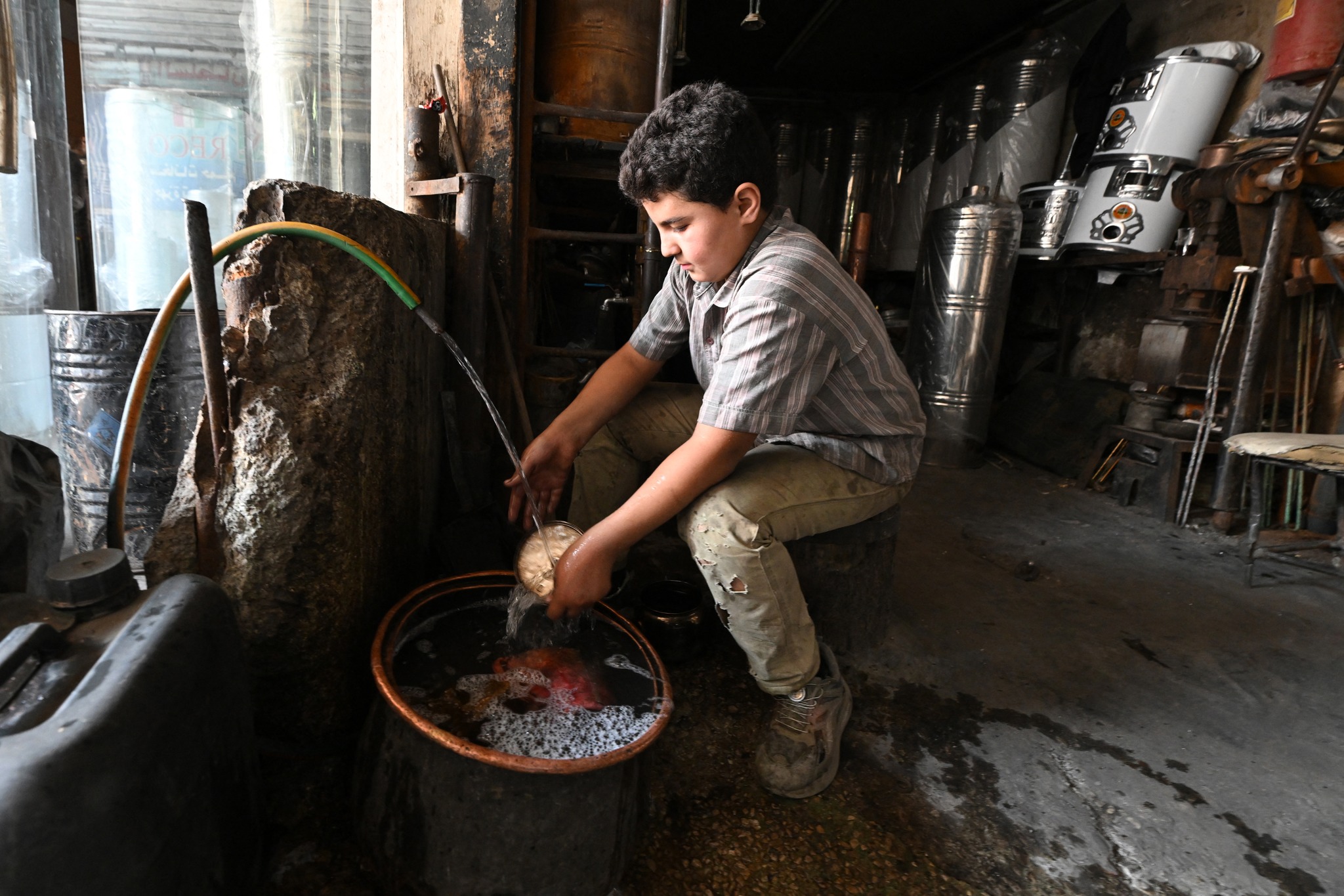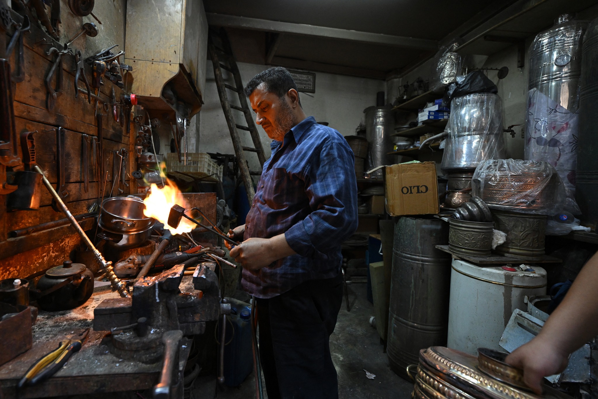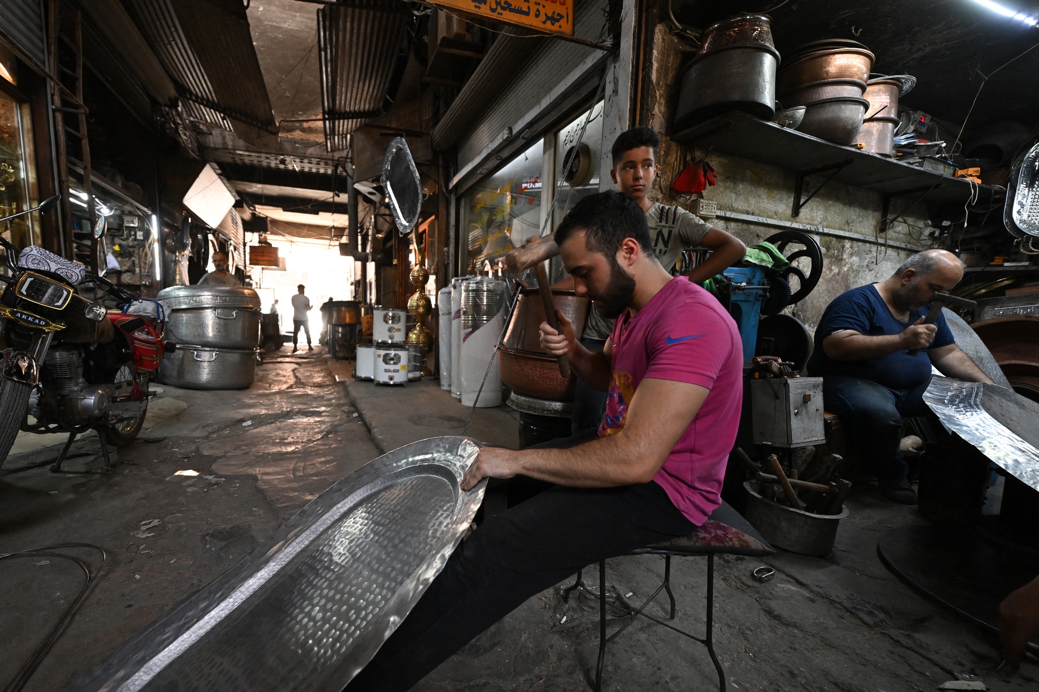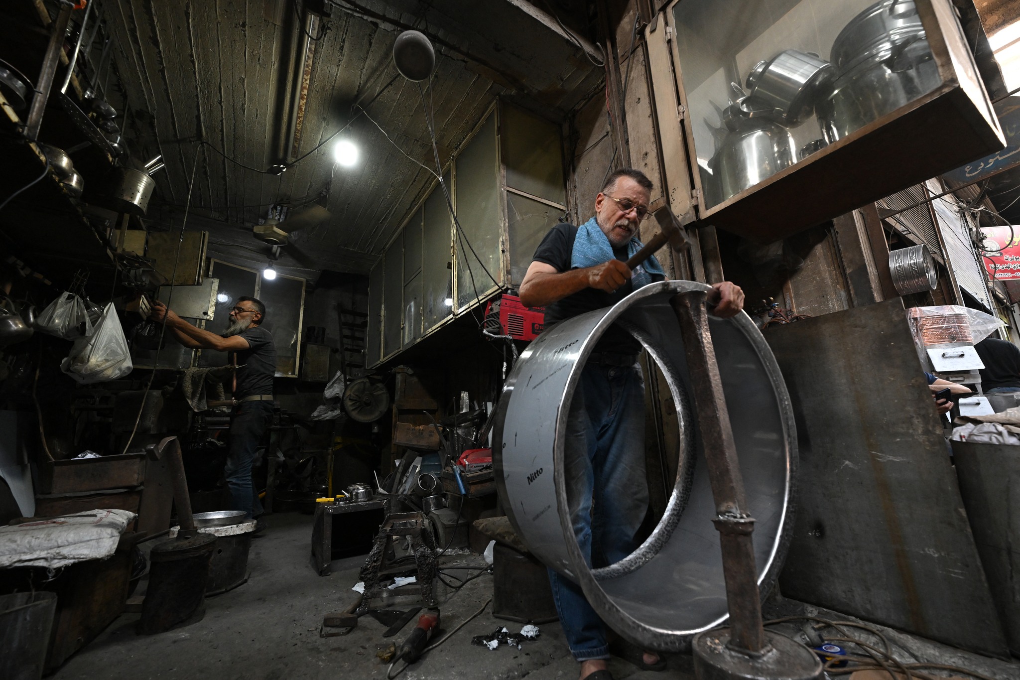 شاركها فيسبوك تويتر لينكدإن بينتيريست البريد الإلكتروني يقوم حرفيون سوريون بنحت نقوش على وعاء نحاسي كبير باستخدام المطارق.