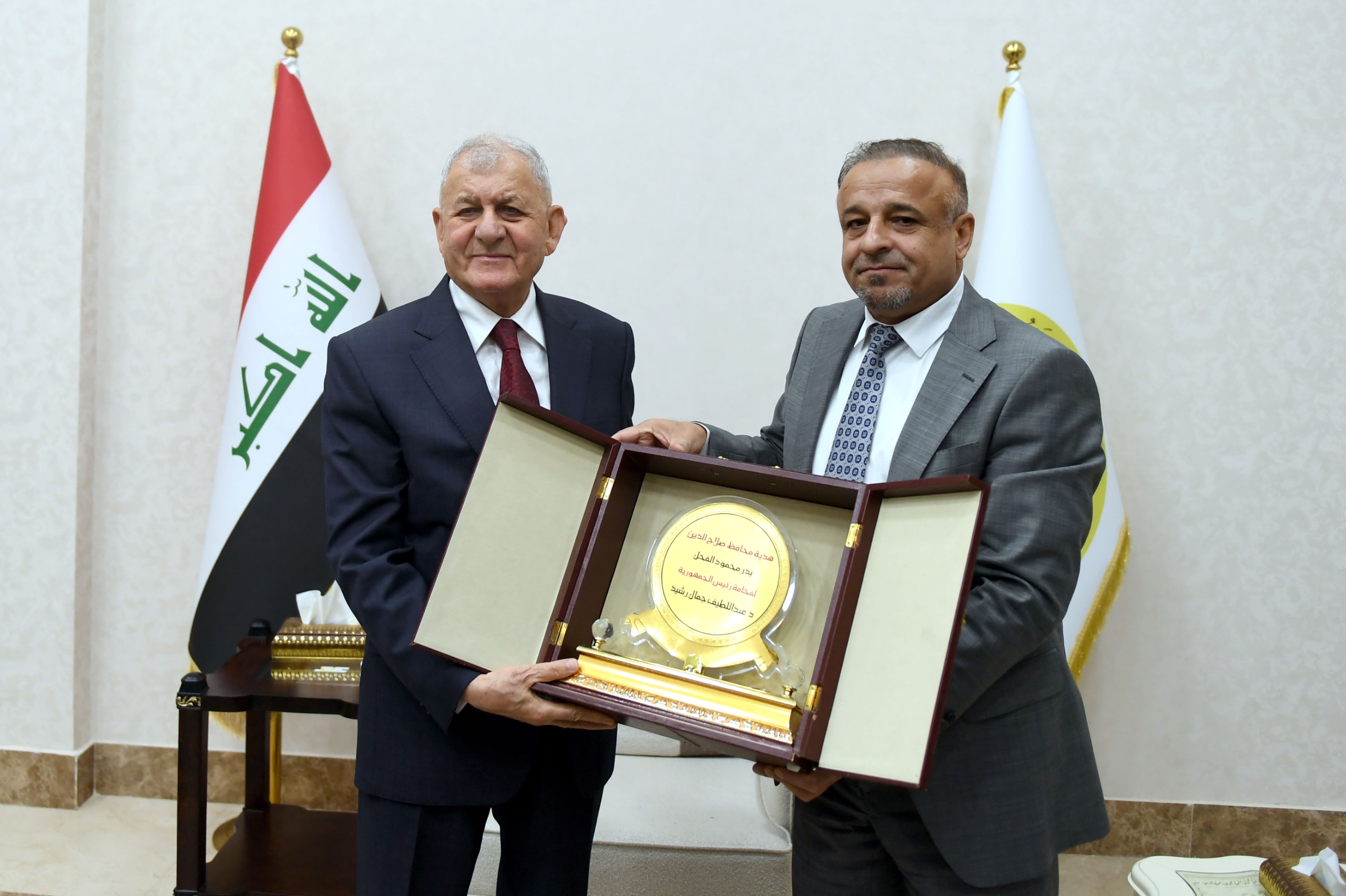 كما قدم المحافظ درع محافظة صلاح الدين للسيد رئيس الجمهورية تقديرا وتثمينا لزيارة إلى المحافظة
