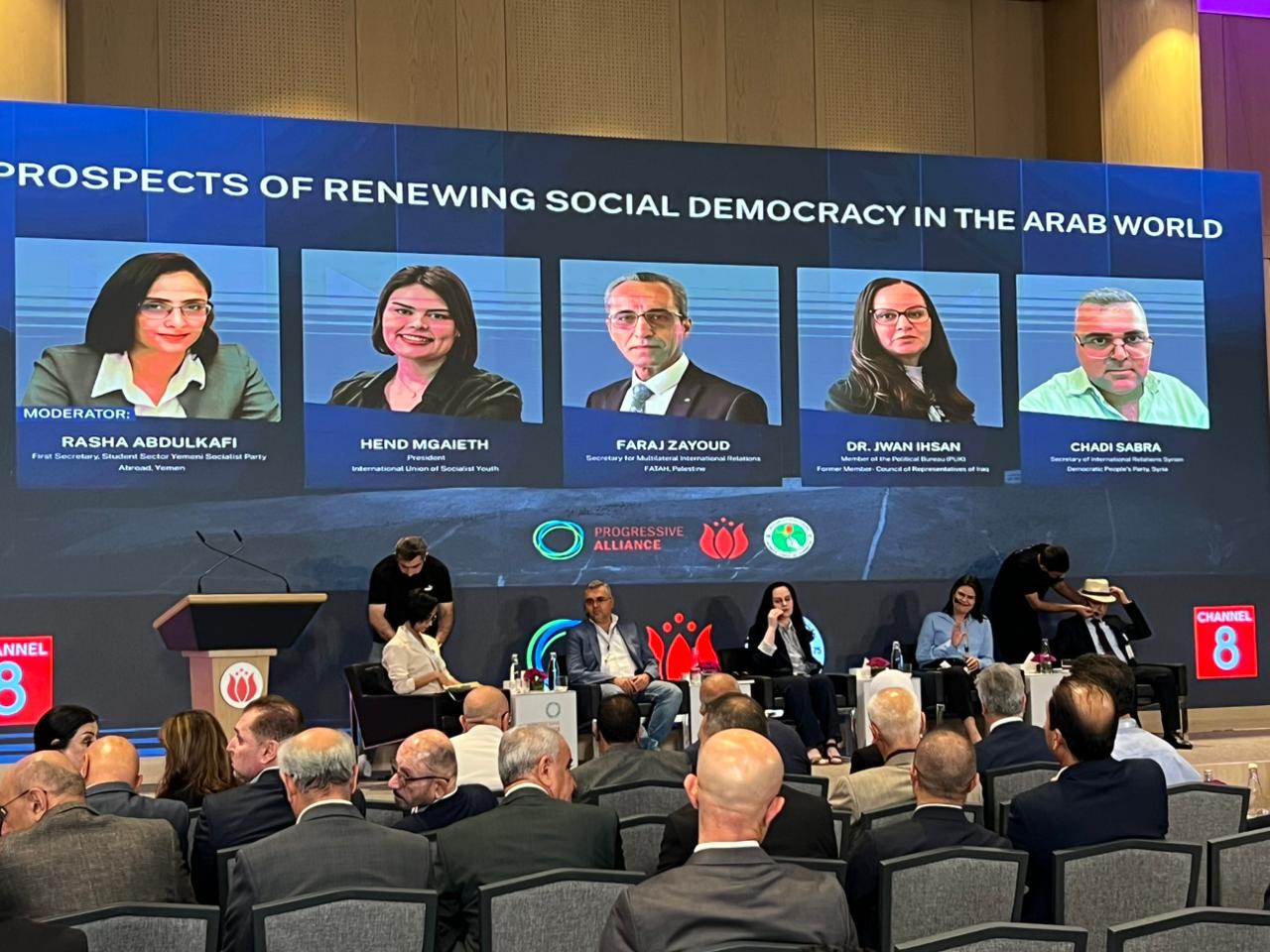 ودعا المؤتمر في جلسته السادسة التي حملت عنوان آفاق تجديد الديمقراطية الاجتماعية في العالم العربي والتحديات الأمنية في المنطقة، قادة الأحزاب الأعضاء في التحالف الديمقراطي الاجتماعي في العالم العربي لمناقشة الوضع السياسي والأمني الحالي في العالم العربي والمسارات المحتملة له.