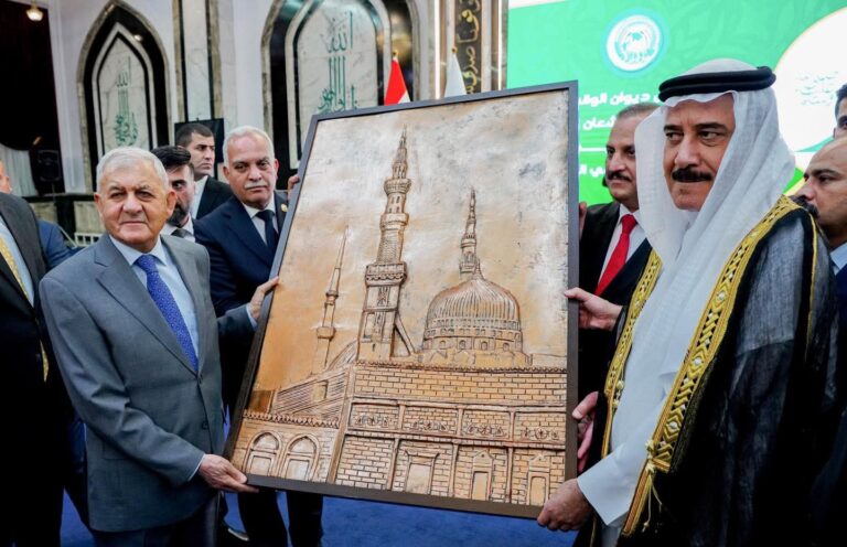 وألقى رئيس ديوان الرئاسة الدكتور كامل الدليمي كلمة في الاحتفال، الذي حضره وزير الداخلية عبدالأمير الشمري، إضافة إلى عدد من المسؤولين والشخصيات الدينية، أكد فيها أن التحديات التي تواجه عالمنا اليوم من صراعات وأزمات وأوبئة وفقر، تذكّرنا بمدى حاجتنا إلى نهج النبي الكريم، إلى الرحمة التي تعيد للإنسان إنسانيته، وإلى الأخلاق التي تزرع في القلوب الطمأنينة والتآخي، وإلى العدل الذي يضمن لكل فرد حقه في الحياة الكريمة.