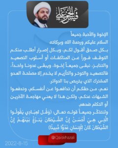وغرد الخزعلي بالقول: إنه “بكل صدق أقول لكم، وبكل إصرار أطلب منكم التوقف فوراً عن المناكفات أو أسلوب التصعيد والتنابز، نبقى جميعاً إخوة، ويبقى عدونا واحداً، فالتصعيد والتوتر والتأزيم لا يخدم إلا مصلحة العدو المشترك الذي يتربص بنا الدوائر”.