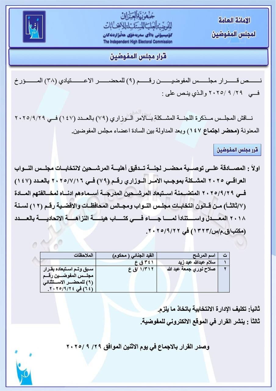 وبين المجلس ،أن”المرشحين المستبعدين هم سلام عبدالله عبد زيد بسبب وجود قيد جنائي فضلا عن صلاح نوري جمعة عبدالله بسبب وجود قيد جنائي “.