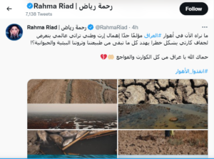 رحمة ذكرت على حسابها الخاص في “تويتر”، أن ما تتعرض له الأهوار يشكل خطراً يهدد كل ما تبقى من الطبيعة في العراق.