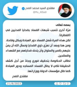 الفساد شمل دور العبادة … الصدر يدعو للتحقيق في حادثة قطارة الإمام علي