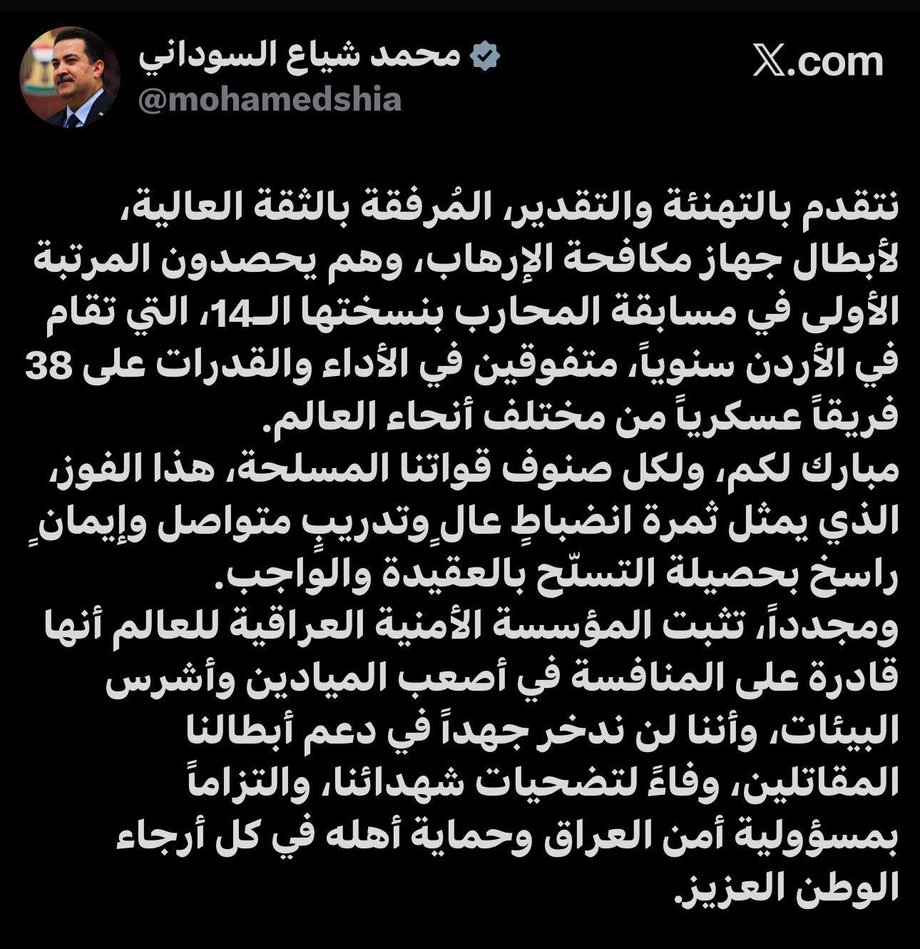 وجدد السوداني،في (منشور على منصة إكس):التاكيد على أن المؤسسة الأمنية العراقية أثبتت للعالم أنها قادرة على المنافسة في أصعب الميادين وأشرس البيئات.