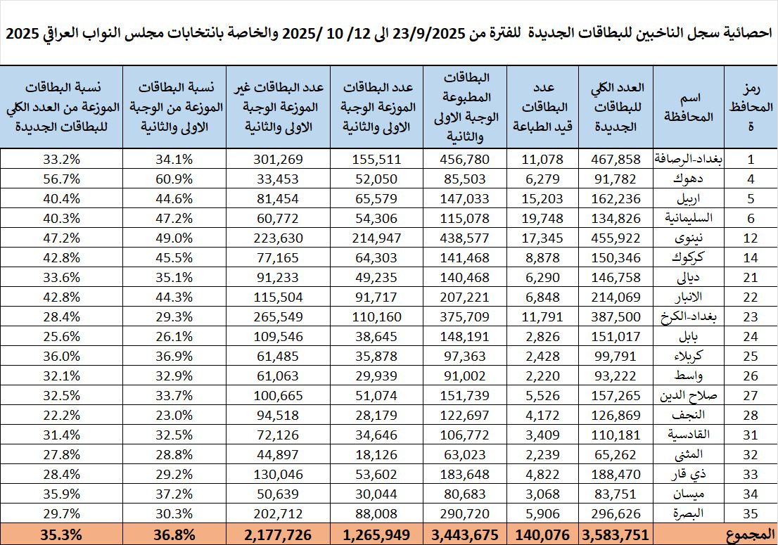 نشرت المفوضية العليا المستقلة للانتخابات الاحصائية بسجل الناخبين للبطاقات الجديدة بانتخابات مجلس النواب العراقي للفترة من 23 /9/ الى 12/10 / 2025 .
