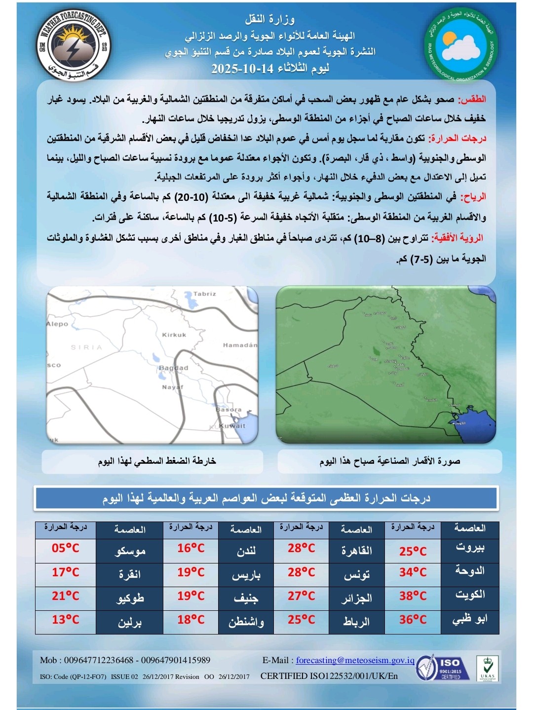 شاركها فيسبوك تويتر لينكدإن بينتيريست البريد الإلكتروني توقعت هيئة الأنواء الجوية، الثلاثاء 14 , تشرين الأول 2025، الحالة الجوية في البلاد للأيام المقبلة، مشيرةً إلى أن الطقس سيكون صحواً إلى غائم جزئياً في عموم مناطق البلاد، مع ارتفاع طفيف بدرجات الحرارة.