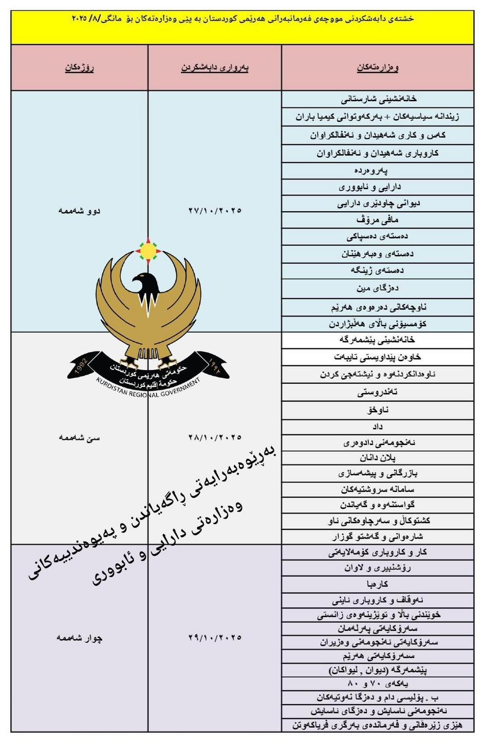 أعلنت وزارة المالية والاقتصاد في حكومة إقليم كوردستان جدول صرف رواتب موظفي الإقليم لشهر آب، بعدما اكدت عن وصول التمويل الى فرع أربيل للبنك المركزي العراق.