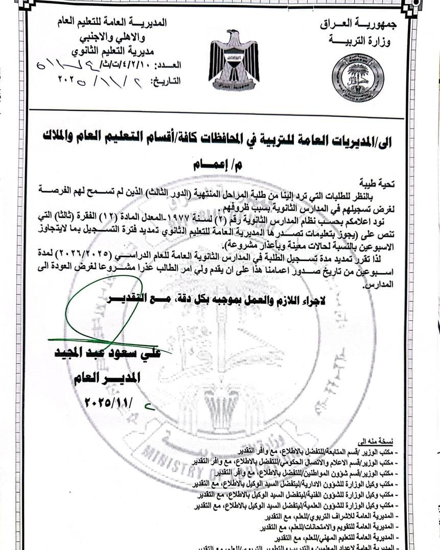 وقالت الوزارة في بيان تابعه المسرى ، ان المديرية العامة للتعليم العام والاهلي والاجنبي تقرر تمديد مدة تسجيل الطلبة في المدارس الثانوية العامة للعام الدراسي 2026 – 2025 لأسبوعين من تاريخ صدور الكتاب أدناه، على ان يقدم ولي الأمر عذراً مشروعاً لغرض العودة الى المدارس.