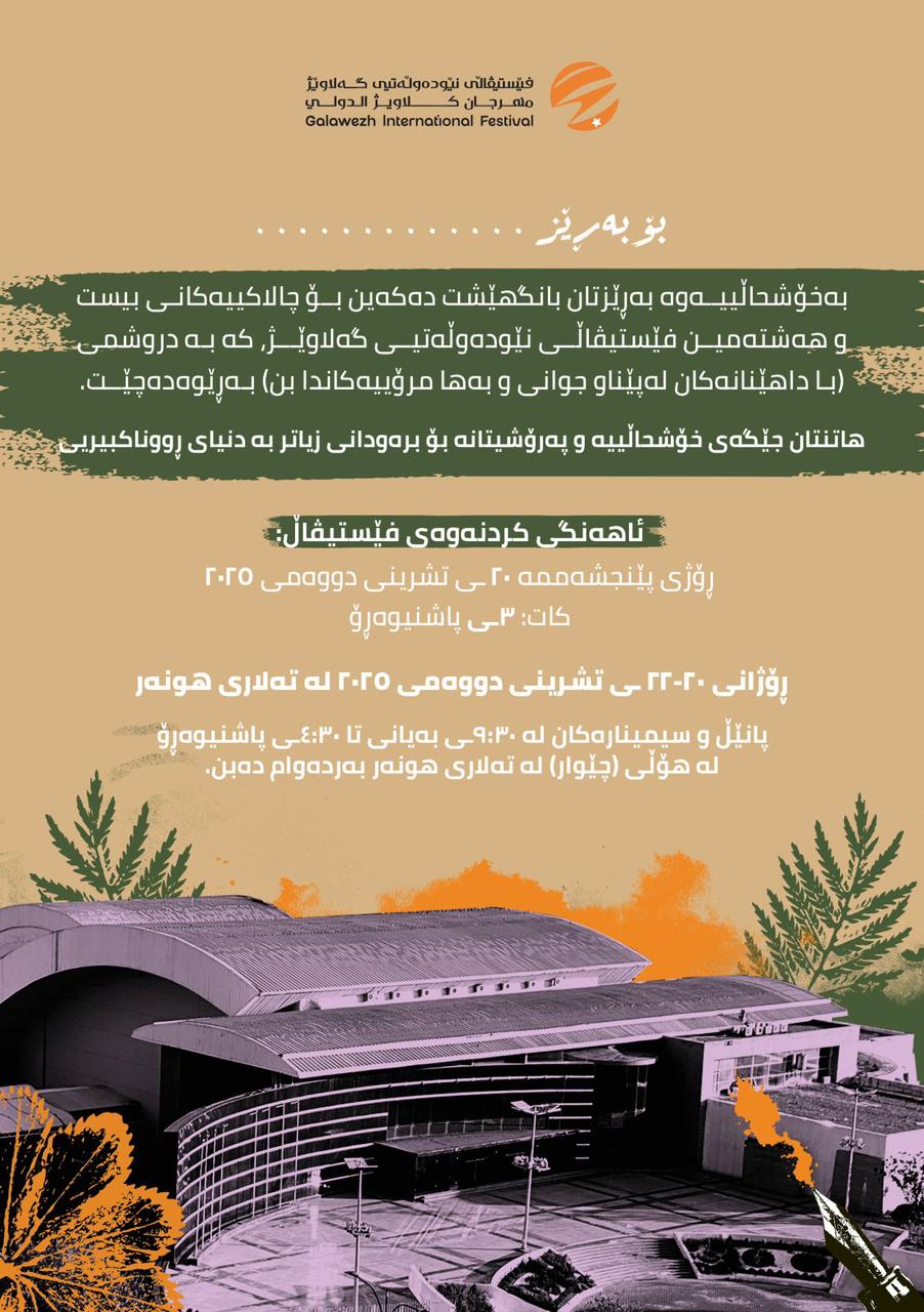 تنطلق الخميس المقبل 20/11/2025 الدورة 28 لمهرجان گلاويژ الثقافي الدولي على قاعة دار الفن بمحافظة السليمانية، بمشاركة العشرات من الكتاب والشعراء والشخصيات الاكاديمية والثقافية من مختلف دول العالم والعراق واقليم كوردستان.
