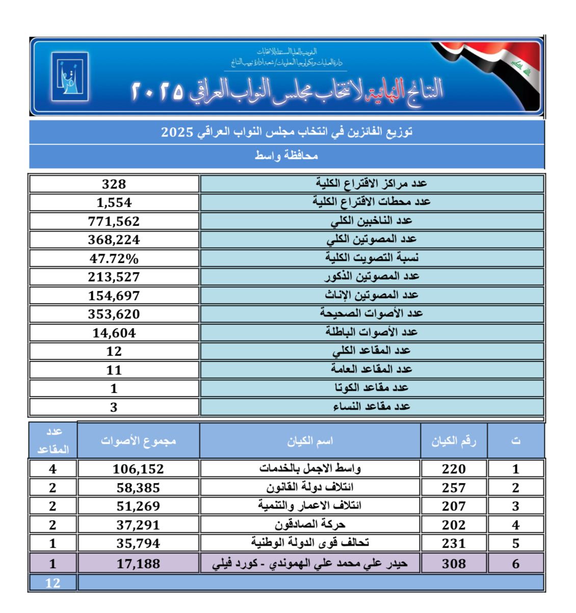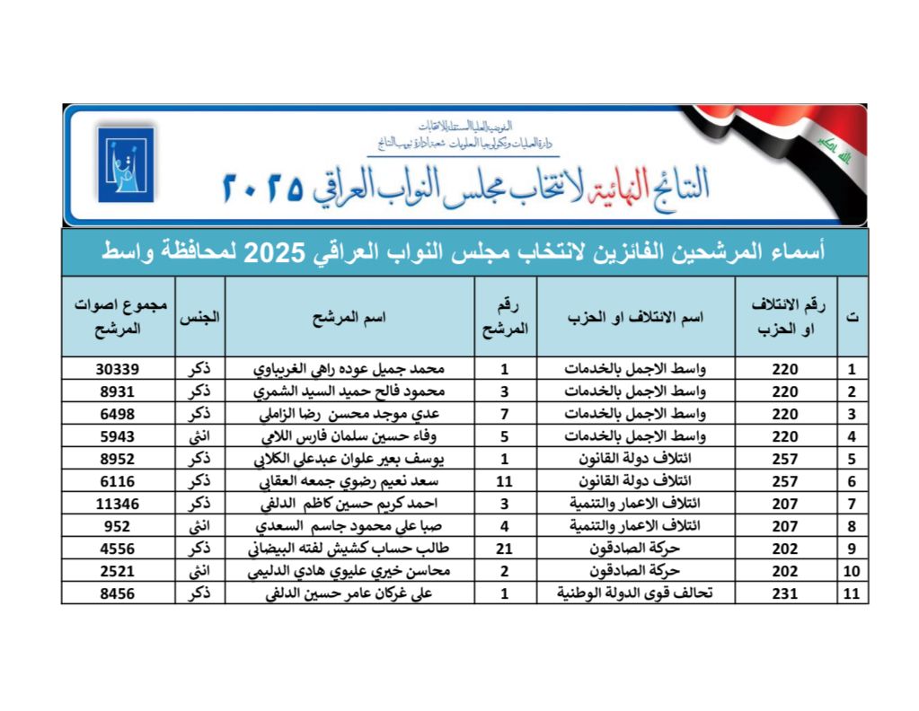 النتائج النهائية للانتخابات البرلمانية في محافظة واسط