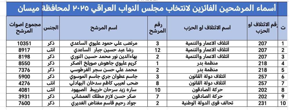 النتائج النهائية للانتخابات البرلمانية في محافظة ميسان